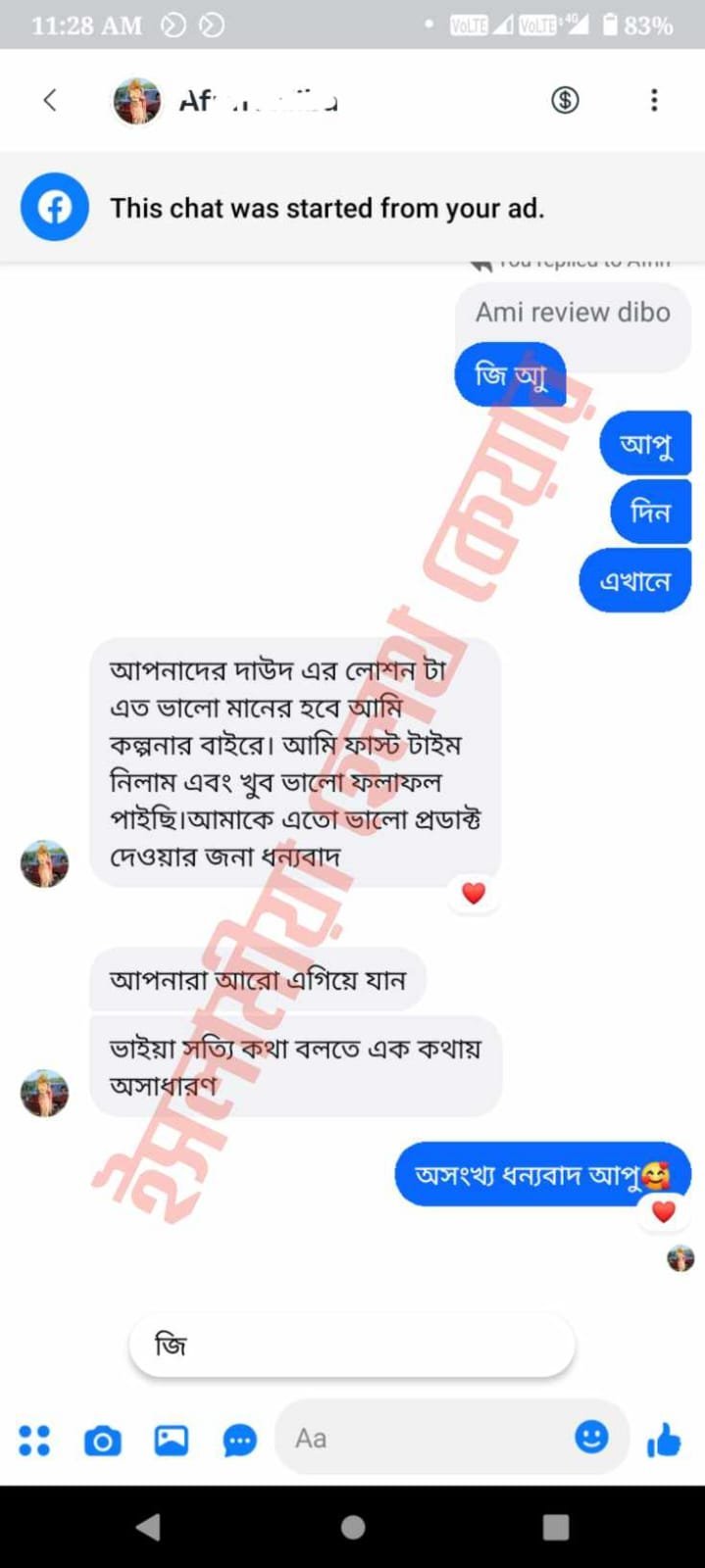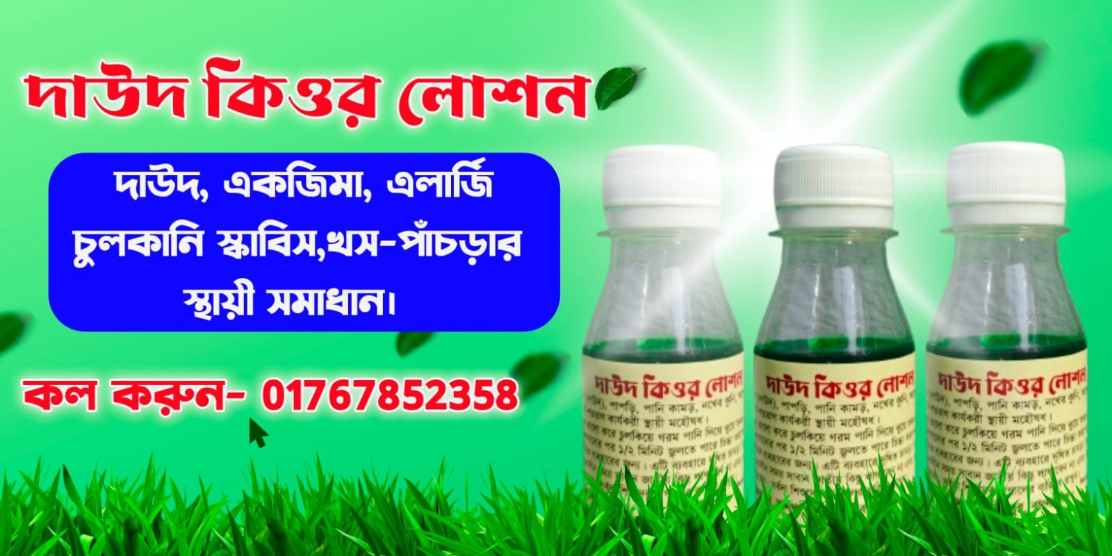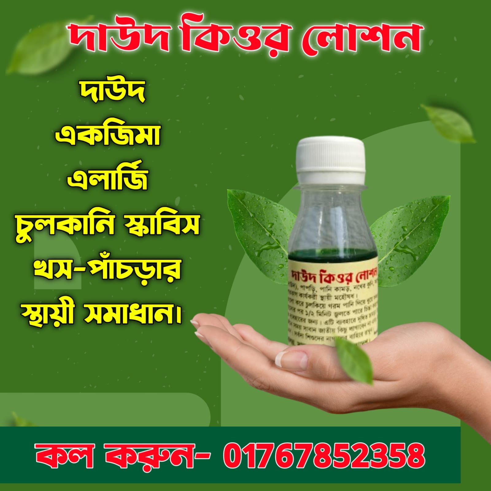 আমাদের দাউদ কিওর লোশন শত ভাগ কার্যকরী প্রোডাক্ট। আমরা ১০০% গ্যারান্টি দিয়ে প্রডাক্ট বিক্রি করি, কাজ না হলে টাকা ফেরত। আমাদের প্রোডাক্টটি ব্যবহার করলে সর্বোচ্চ ৭-১০ দিনের মধ্যে স্থায়ীভাবে সেরে যাবে। ইনশাল্লাহ